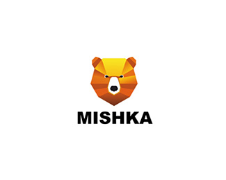 MISHKA幾何熊創(chuàng)意標志設(shè)計,使用幾何色彩堆疊出熊的面部層次,整體以棕色和橙色作為主識別色。