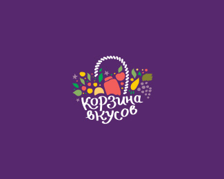 Корзинавкусов食品公司標志設計,整體是一個籃子的造型,用各種水果、商品和品牌名稱構成,顏色豐富、亮麗。