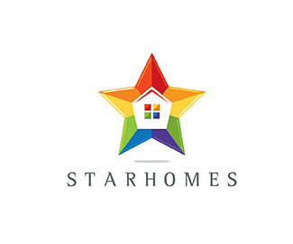 房產(chǎn)中介公司標(biāo)志使用了色彩鮮明的五角星圖案,中間鏤空的房子圖案體現(xiàn)行業(yè)特征,標(biāo)志色彩鮮明,寓意美好的家居生活和多彩的房源。