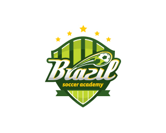 Brazil Soccer Academy巴西足球?qū)W校標志設(shè)計,融入足球場和足球元素,以綠色和黃色作為主識別色。