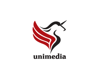 Unimedia廣告公司標(biāo)志設(shè)計(jì)欣賞,使用天馬作為廣告公司標(biāo)志的主創(chuàng)意圖形,整體以紅色和黑色的色彩組合。